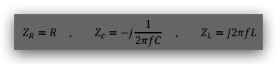 In the previous equations ZR, ZC and ZL are the impedances of the resistor, capacitor, and inductor respectively. R, C and L are the values of the resistance, capacitance and inductance respectively.