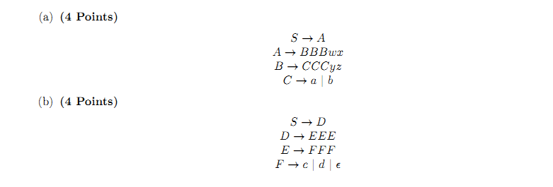 1. (8 Points) For each of the following context-free grammars, state the number of valid inputs supported by that grammar. As an example, the grammar G : E ! a j b j c results in 3 valid inputs—a, b, and c. Note that the empty string may be a valid input wherever applicable (this means that if an empty string is a possible input, you should consider it as part of your total count). You also do not need to list the different possible inputs.